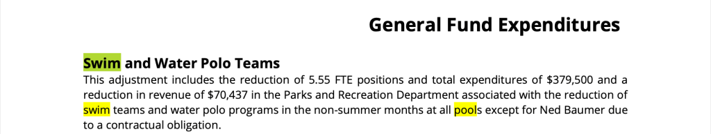 - Diverse usage of community pools: Community pools should aim to serve a diverse range of interests and needs throughout the year. By reducing swim team and water polo programs, the city may be neglecting the interests of a significant portion of its population who enjoy these sports. Families with more resources and opportunities may turn to clubs or private facilities that cost significantly more and that may be further from their neighborhood and community, creating a greater disparity in the quality of athletic swim programs and creating a larger inequity among all residents.