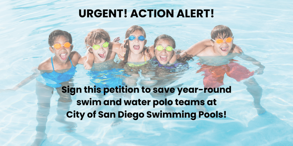 In the budget recommendations released by San Diego Mayor Todd Gloria for Fiscal Year 2025 there is a recommendation to call for the reduction in recreational swim team and water polo programs in the non-summer months at all pools except for one that is contractually obligated to do so (page 483). We are unsure if this is a one-time cut for FY 2025 or will be ongoing. Support is needed now to let elected officials and other decision-makers know your concern for these reductions, which will hurt our entire community. Read more about these budget recommendations here.