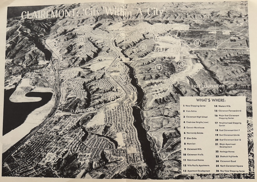 This early Clairemont started as a consolidation of unfamiliar locations: Morena Mesa, Hollingsworth Estates, Peavy Ranch, Mission Bay Heights, and Tecolote Heights. The Clairemont of today includes more familiar names encompassing residents bordering Linda Vista from the south, north to Highway 52, on the east is Highway 805 extending west to the edges of Mission and Pacific Beach.
