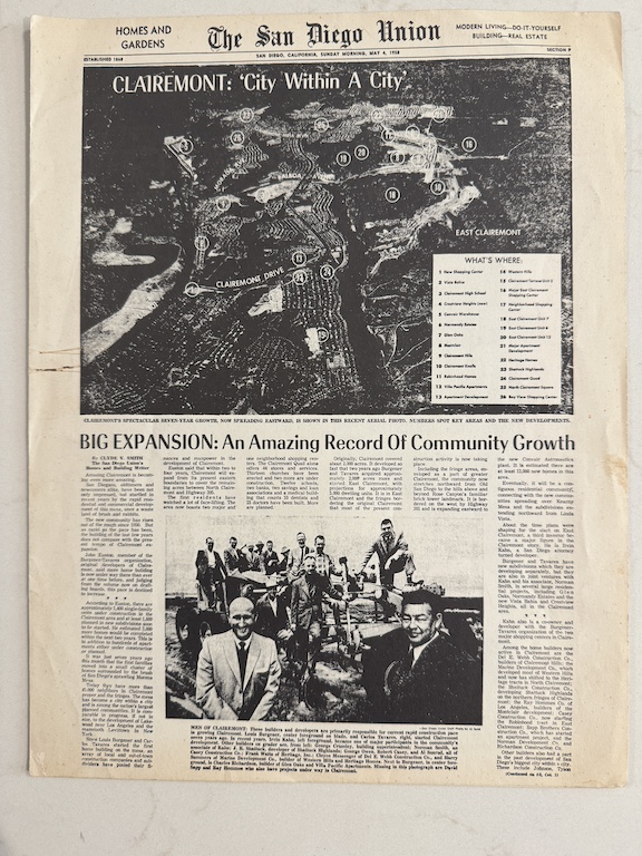 Clairemont, a large community within the City of San Diego, has a rich and memorable history. Clairemont started as a vision in the minds of two San Diego developers, Carlos Tavares and Louis C. Burgener. Tavares, a civil engineering major from Notre Dame University, and Burgener, a business economics major from the University of Utah-Salt Lake teamed up in 1950 to make their vision of Clairemont a reality: acquiring land, seeking design ideas, and input from land planning engineers throughout the United States and commissioning architects to design high-quality homes and apartments with a variety of floor plans.